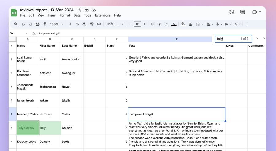 Please note that the main challenges are with the need to manually do the search and export to spreadsheets to do detailed analysis. Also, this limits the businesses that have multiple locations and have problems analyzing and comparing reviews by keyword that might be a common theme for both locations. And ifnnaly, the native search for Google reviews doesnt allow search by customer name which means is very hard to find a particular person’s review.